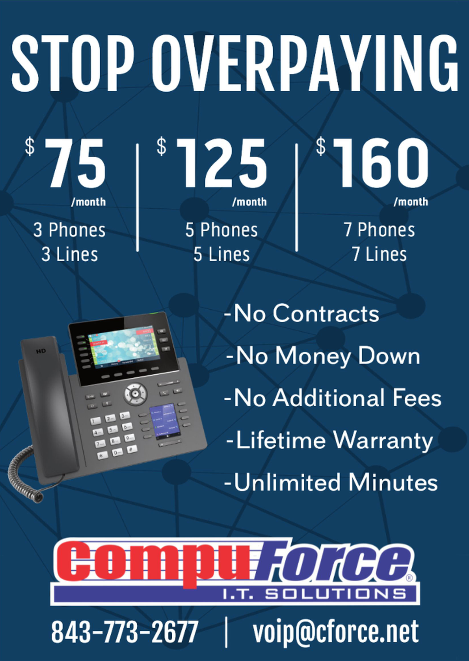 VoIP is short for Voice Over Internet Protocol, or in normal words, phone service over the Internet. If you have a decent internet connection you can get VoIP service through CompuForce and save money while adding reliability and new features.